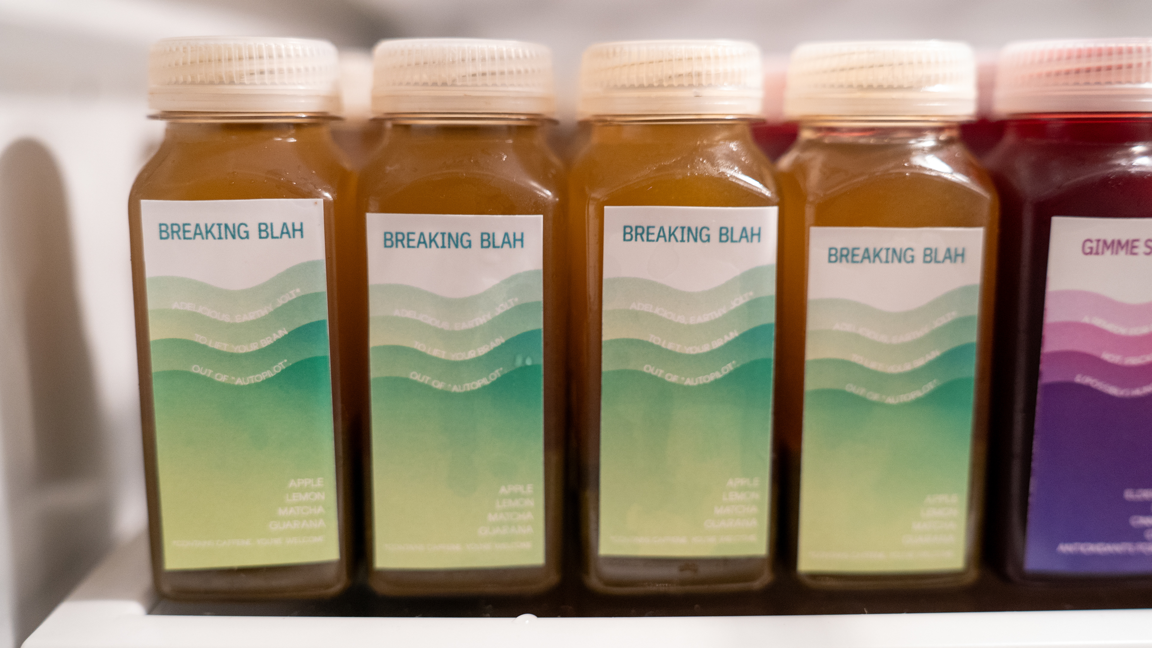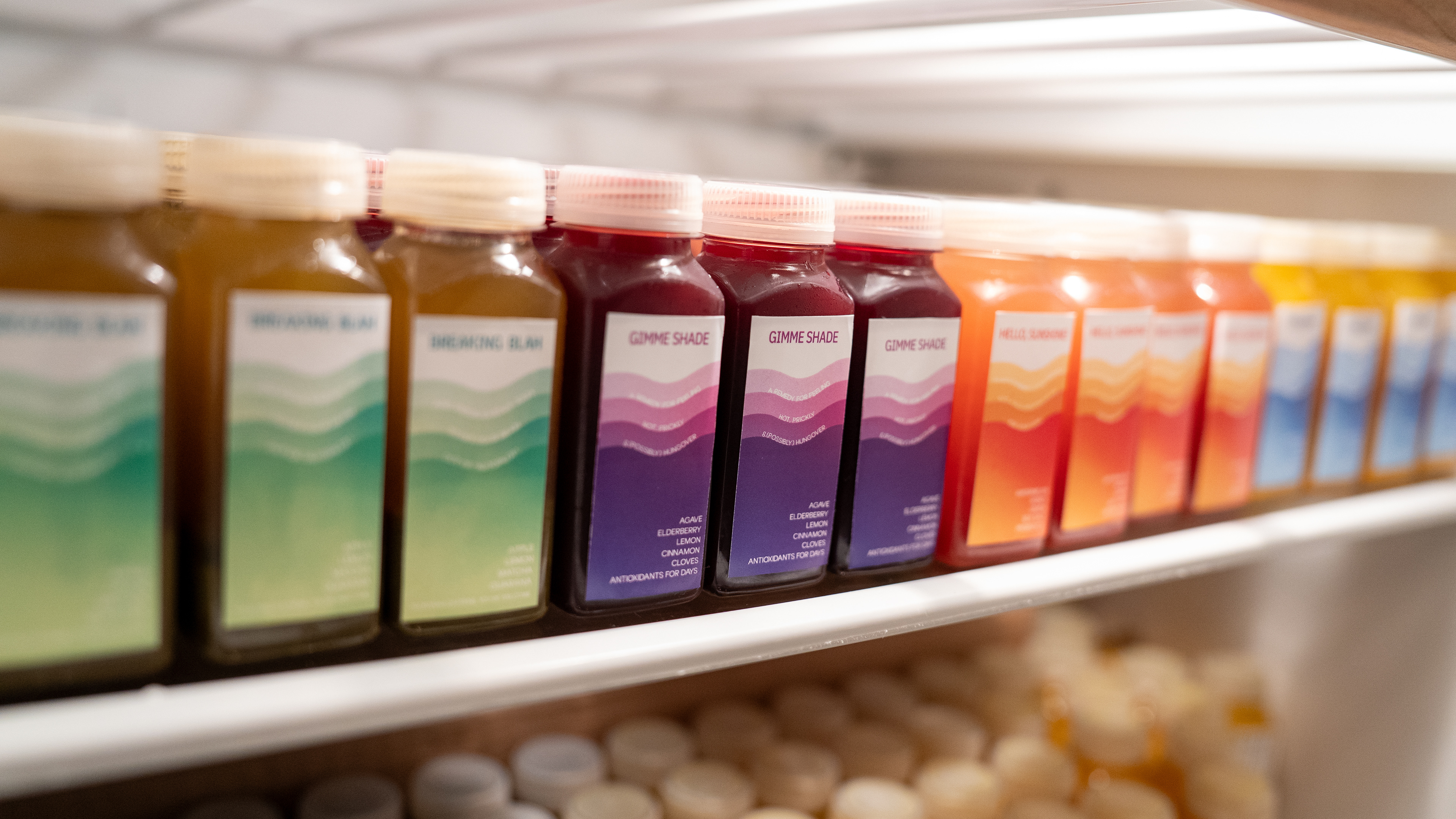 Custom juice bar graphics & labels, tying weather, mood, and wellness into a sensory moment